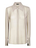 La camicia da donna Liu Jo in georgette color avorio presenta un caratteristico colletto alla francese impreziosito da perle. Le maniche lunghe e i polsi con spacchetto e perle conferiscono un tocco di eleganza. Completa il look il logo in metallo sul retro e la chiusura coperta con bottoni. Realizzata con cura in Italia, è un capo distintivo della linea "Liu Jo Better".