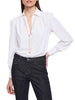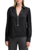 Una blusa Gaudi da donna in crêpe de chine nera con scollo a V e collana a catena in metallo dorato. Perfetta per un look minimal chic, leggera e versatile. Ideale per la donna che ama l'eleganza senza tempo e dettagli raffinati. Con manica lunga per un tocco di classe in più.