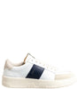 Sneakers in pelle bianca, punta traforata con rinforzo in camoscio, inserto laterale in pelle blu, stringhe avorio, patch logo sulla linguetta.
