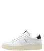 Sneakers vintage basse da uomo in morbida pelle, para avorio cucito effetto "vintage", lacci in cotone avorio, dettaglio sul tallone in pelle nera, interno rivestito in spugna di cotone e pelle, plantare interno in lattice rialzato 2,5 cm.